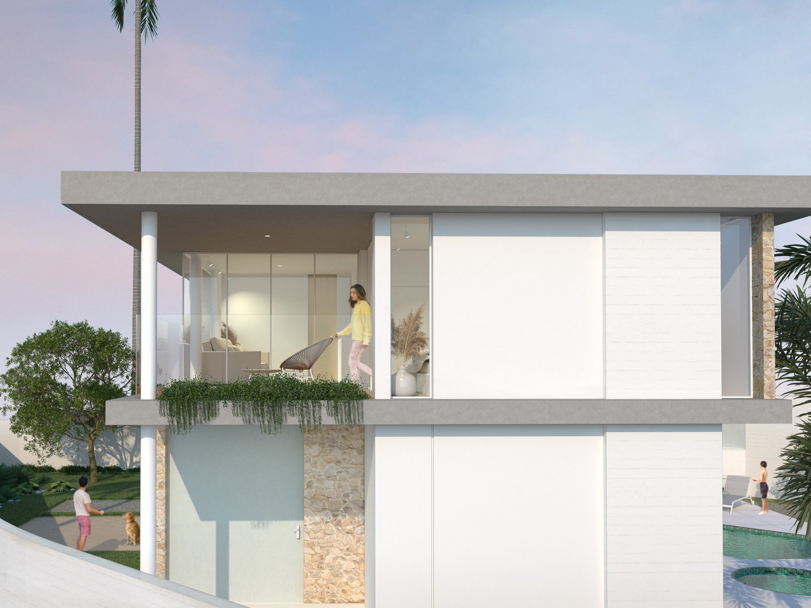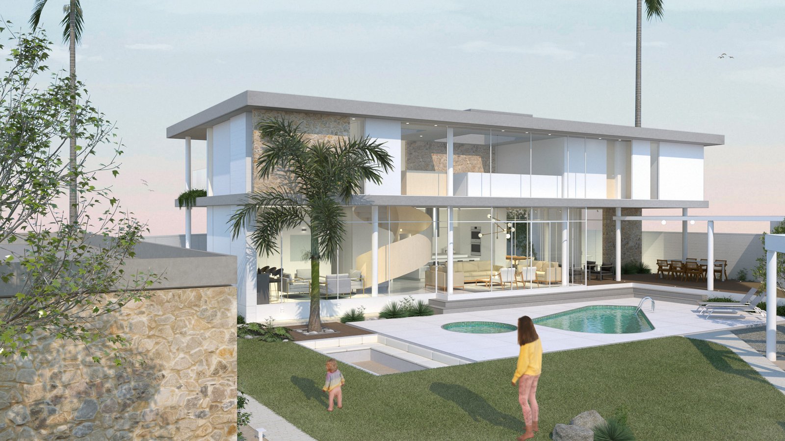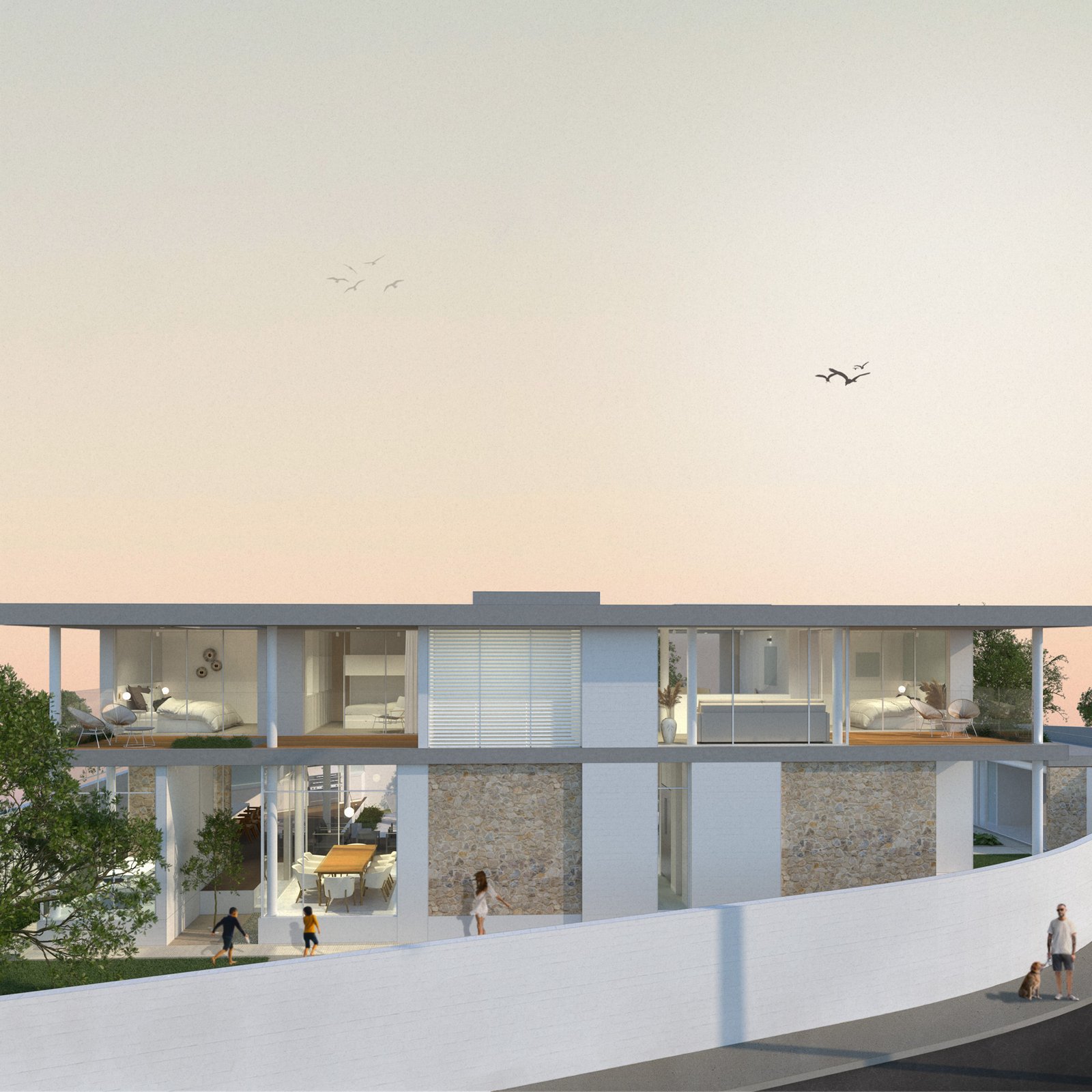 El proyecto se encuentra ubicado en la zona de Punta Blanca, localizado en un terreno de esquina adyacente al mar. Por la morfología del terreno, se busca adaptar el diseño para aprovechar de mejor manera la espacialidad, vistas y necesidades del cliente. El proyecto se encuentra compuesto por dos elementos, el primero un Pivote, en donde se desarrolla la vida más íntima de la familia, y un segundo elemento independiente la casa de invitados, ambos elementos se unifican por medio de las áreas sociales. La residencia familiar se desarrolla por medio de espacios de doble y triple altura, jardinerías y espacios comunes que buscan entregarle dinamismo a la ocupación del usuario. El espacio exterior funciona como anclaje visual de los espacios sociales de ambas casas, todas las habitaciones buscan su mirada hacia el mar, por lo cual se desarrolla un gran balcón continuo que logre captar la mayor cantidad de visuales e iluminación natural.